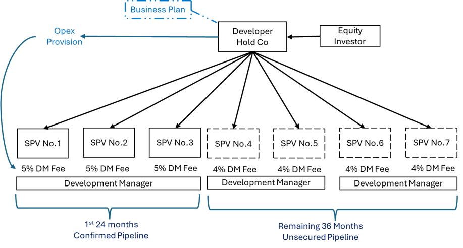 A pre-defined framework will be in place confirming scheme criteria, with each new scheme subject to investor approval and due diligence. New SPVs and shareholder agreements will be established once approved, with a development manager fee provided for operating expenses.