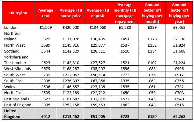 Research by Santander Mortgages has found that the average monthly rent in the UK is £912 per household, compared with monthly repayments of £723 for the average first-time buyer household.